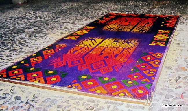 On Thursday before Good Friday, we took a stroll through Antigua’s main streets to witness the “alfombras” or carpets being designed and laid out. Alfombras are as varied in design as they are in construction materials. The most popular alfombras are made out of dyed sawdust.