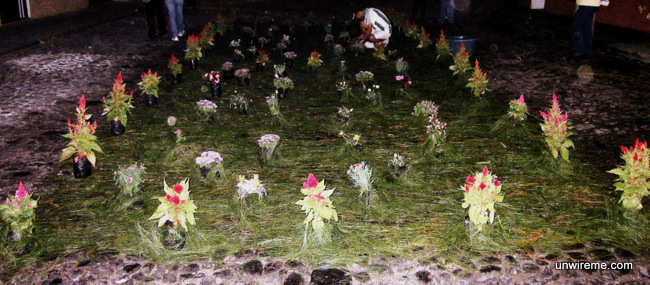 When we returned, alfombra building was still going on in earnest, with the aid of huge floodlights.
